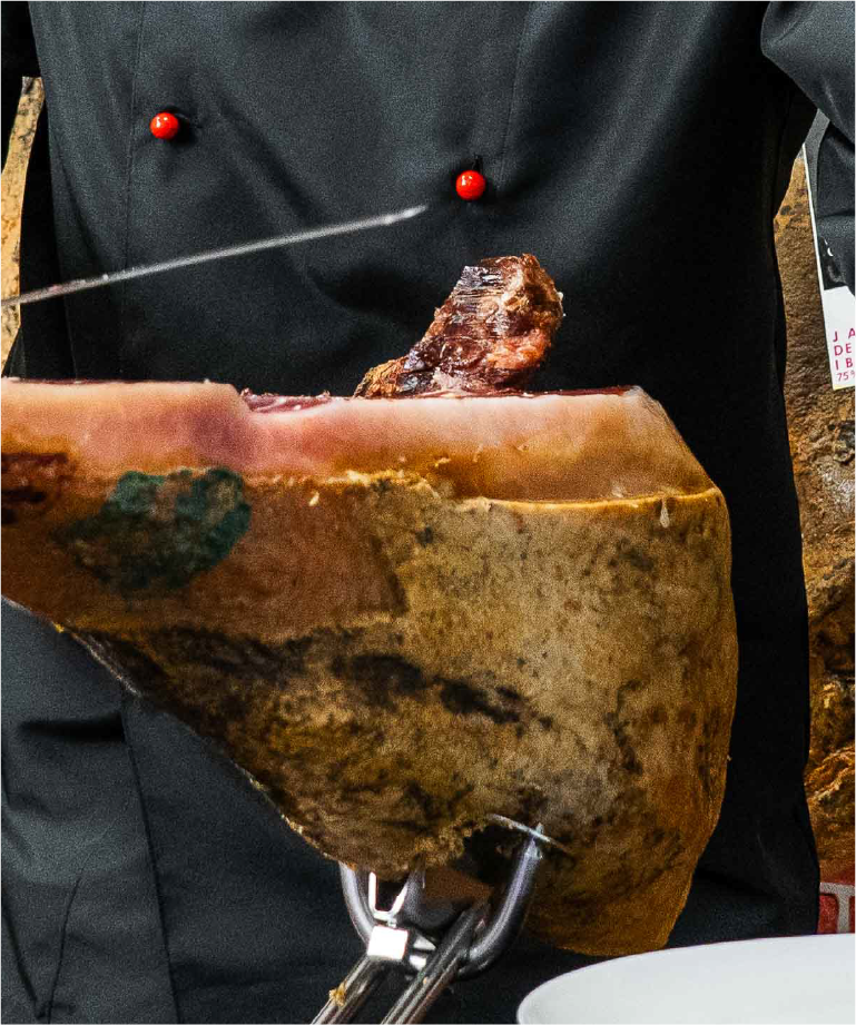 Jamón ibérico de Guijuelo seleccionado en origen: cebo, cebo de campo y bellota. Entero o en sobres cortados a cuchillo. También DOP Teruel.