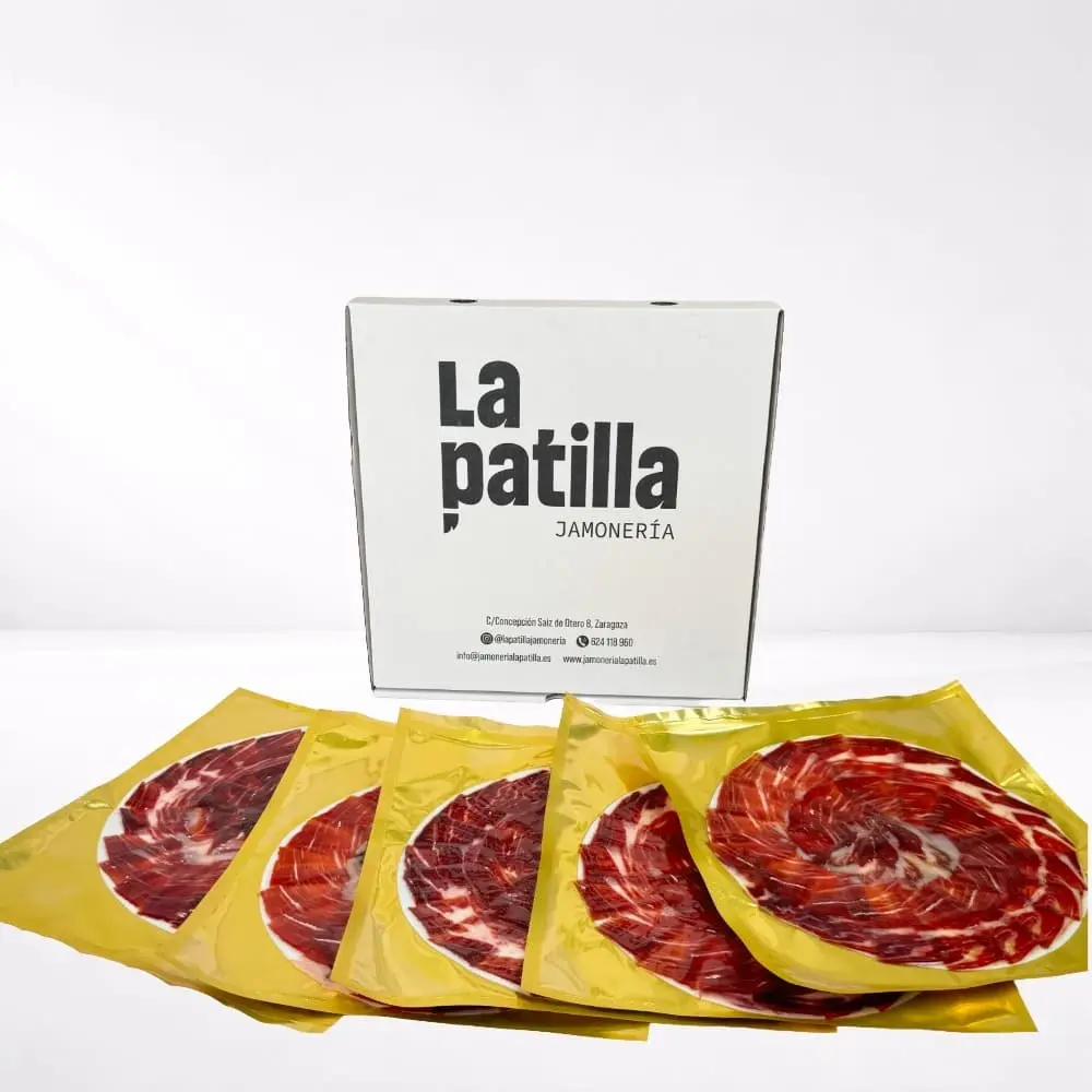 Este pack de sobres de jamón está elaborado a partir de jamones FISAN Alta Gastronomía, seleccionados y cortados a cuchillo por Jamonería La Patilla y envasados al vacío en sobres individuales de 100 g, listos para disfrutar en cualquier momento.